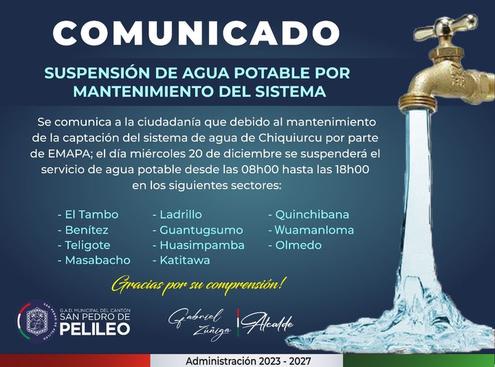 El GAD municipal del cantón San Pedro de Pelileo, pone en conocimiento de la ciudadanía la suspensión del servicio de agua potable en varios sectores.