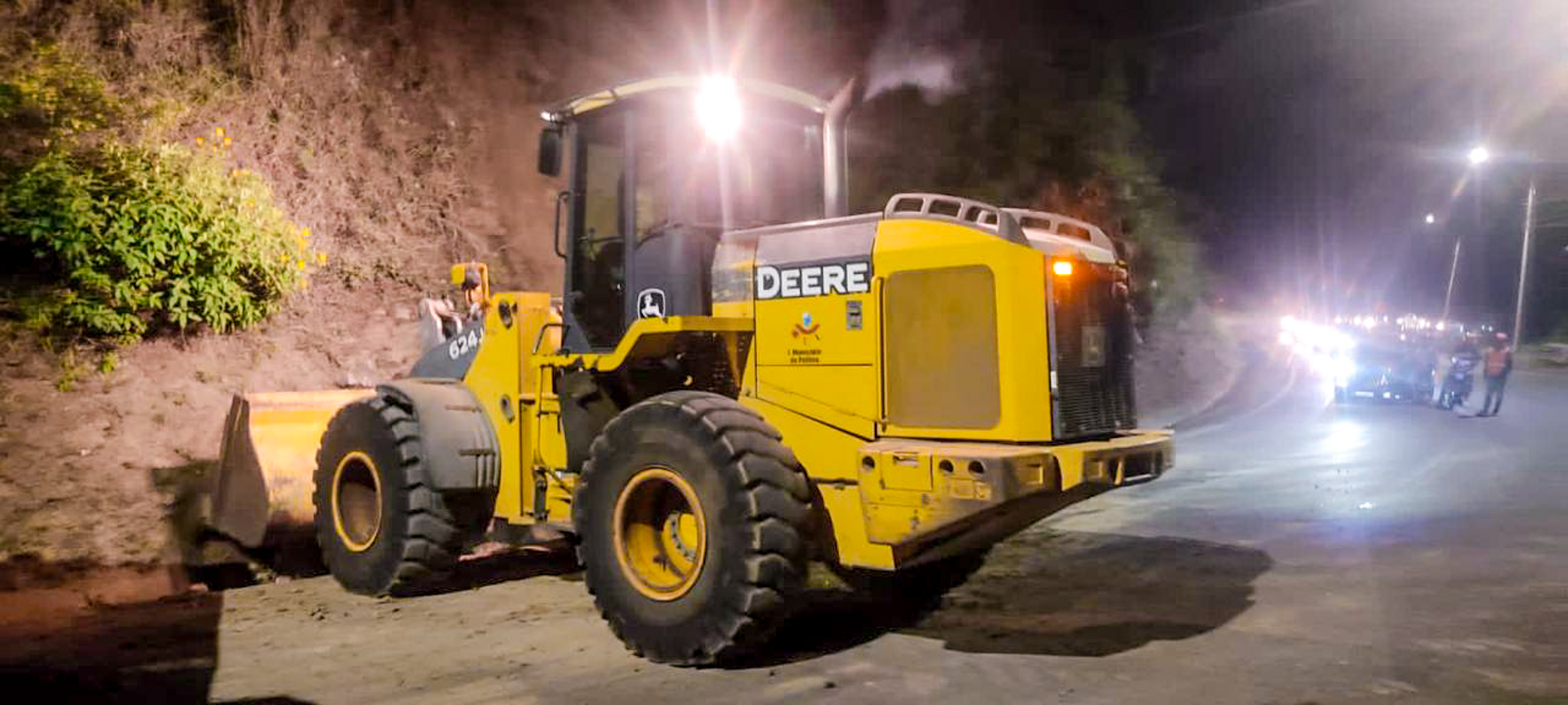 Ni el horario, ni las condiciones climáticas, impidieron el trabajo de la cuadrilla de Obras Públicas la noche de ayer en la limpieza de la vía a Baños, a la altura del sector El Pingüe, que fuera obstaculizada por el deslizamiento de materiales desde la parte alta.
