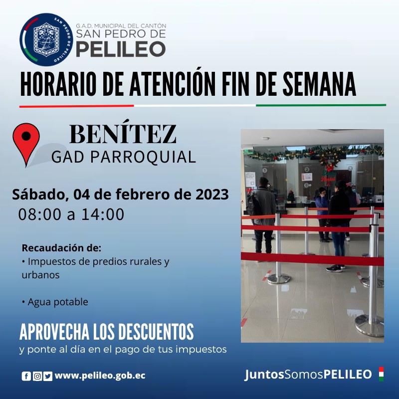 La Brigada de recaudación del GAD Municipal de Pelileo atenderá en la parroquia Benítez el sábado 4 de febrero, para que sus habitantes puedan beneficiarse de los descuentos al ponerse al día en sus obligaciones tributarias.