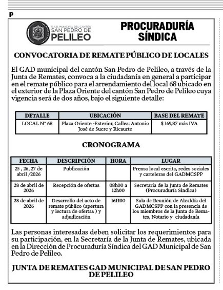 Noticias Slider COMUNICADO REMATE PLAZA ORIENTE gadpelileo 27 abril, 2026 No Comments CONOCIMIENTO PÚBLICO