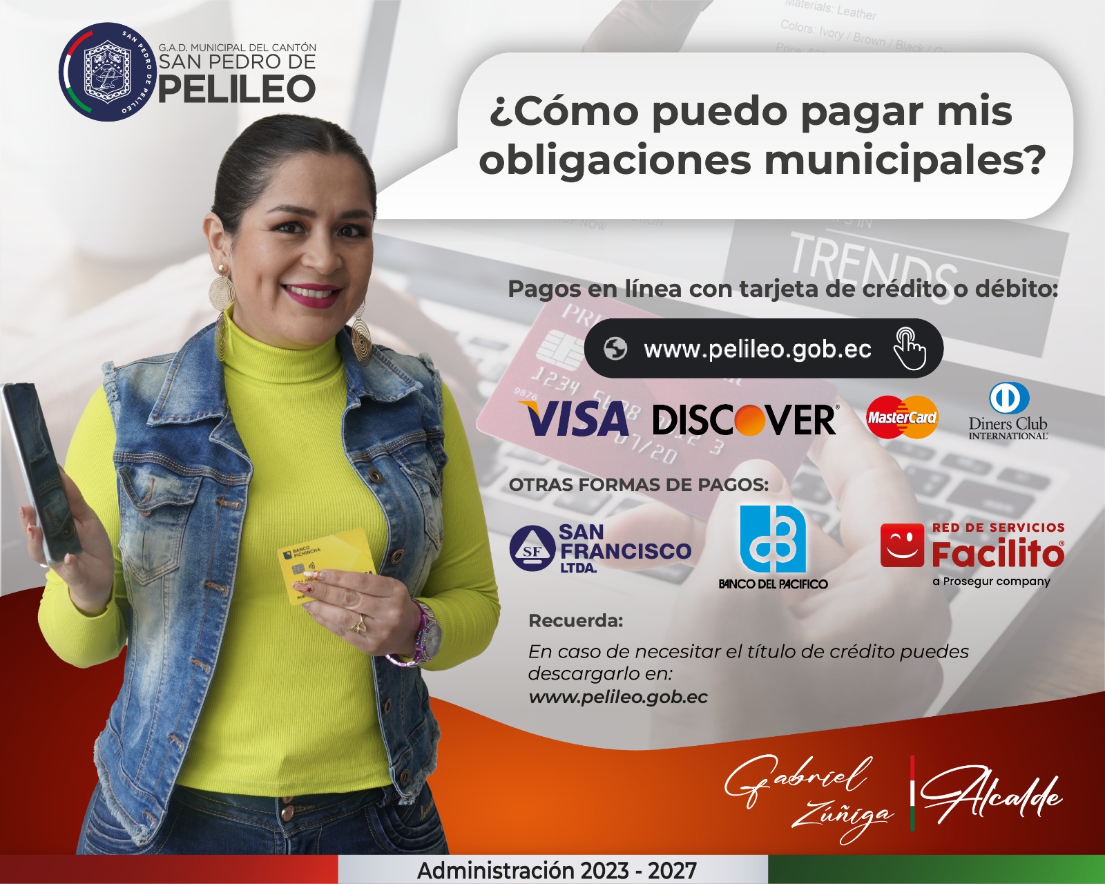 Para su mayor comodidad, a más de los puntos de pago ubicados en la municipalidad; también puede cumplir sus obligaciones tributarias desde la comodidad de su casa, mediante su tarjeta de crédito o en las instituciones financieras y locales adscritos a la red Facilito.