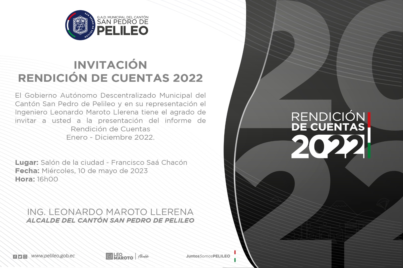 Invitamos a toda la ciudadanía a la Audiencia Pública de Rendición de Cuentas 2022 del GAD Municipal del cantón San Pedro de Pelileo.